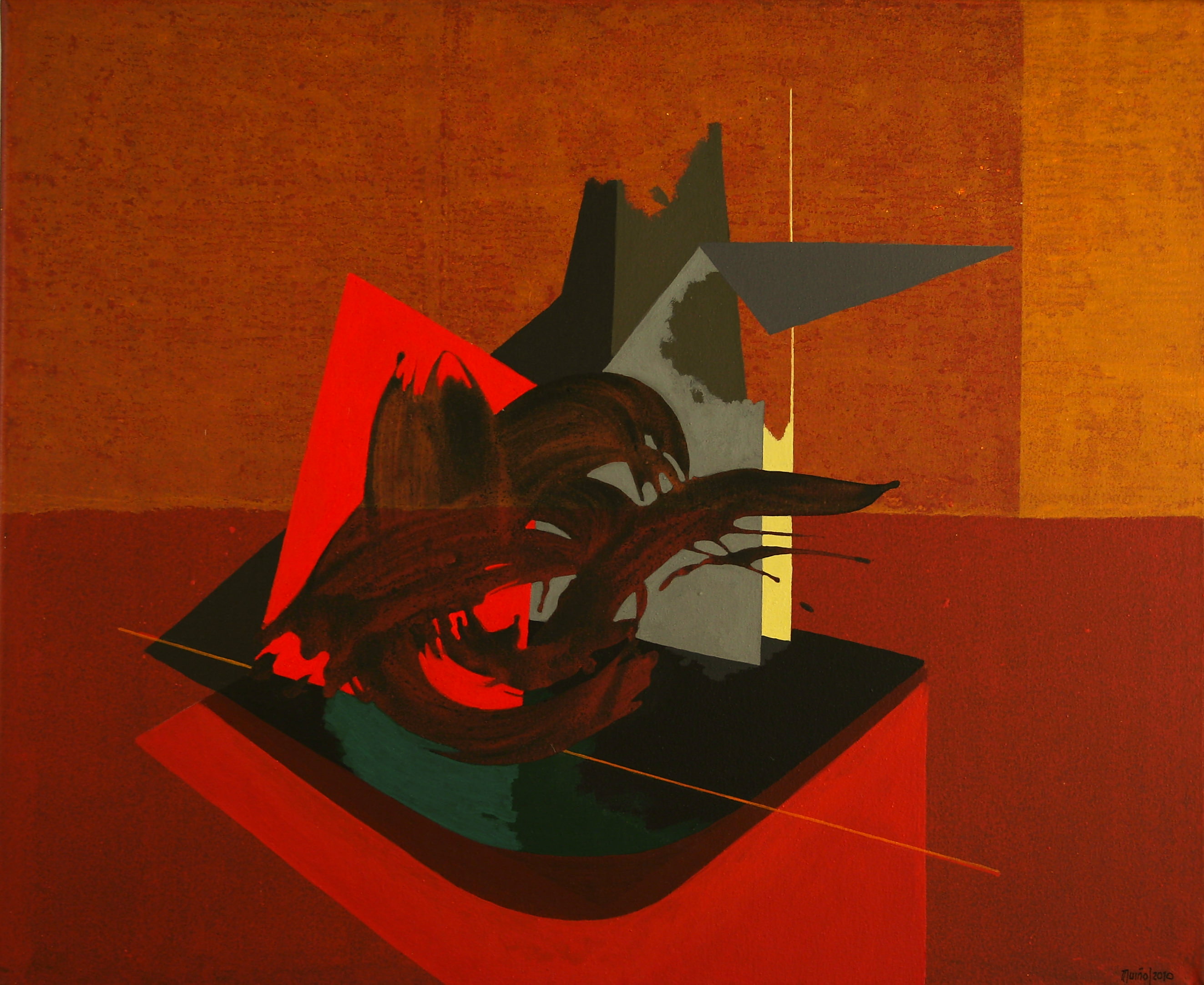 Hay un continuo ascenso y descenso de hilos finísimos que se tienden como rastros de luciérnagas junto a figuras hieráticas, siluetas y diapasones que se estiras para captar la pitagórica música de la esfera; lo que queda perfectamente ejemplificado en el cuadro que titula “LOS SONES DEL MATEMÁTICO”, donde codifica bases triangulares rojas en forma de dientes de sierra, curvas ondas azules paralelas y rectas convergentes y divergentes sobre un espacio ocre por el que se fugan, vuelos, aires, giros, tensiones quebradizas de color dorado o carmín y silencios como labios negros.
